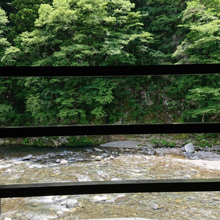 こちらは、1階露天風呂付の蘇芳(すおう)からの景色です。今の季節は何種類もの緑が綺麗ですね。個人的には芽吹いたばかりのやわらかい緑が好きです。